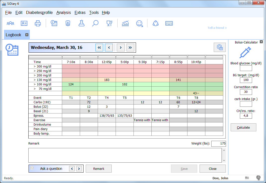 Diabetes-Software SiDiary: Detailed logbook Now you can start immediately with data capturing! Click on the grid at any place and enter a value (Blood glucose levels will be re-ordered to the appropriate row automatically) With the arrow buttons you can navigate to the previous or next day or week or you can open a calendar picker or the nutrition database. Also you can start the wizard for sending your (encrypted) data by email or to read your blood glucose levels from a BG meter.