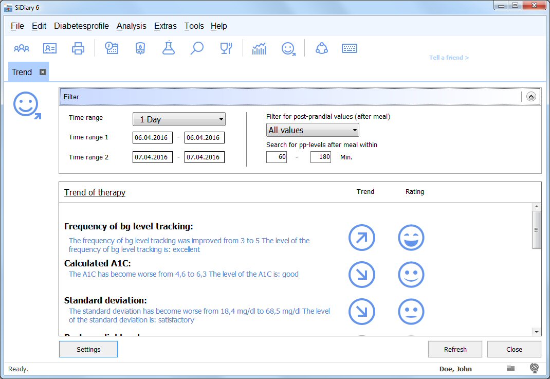 Diabetes-Software SiDiary: Trend analyzis When you've tracked some readings, you can use the trend function for a rating and a trend of your current condition. You can select a time range and will get the results with the 'Refresh' button. Of course the results will become better with more captured data! All limit values for the ratings can be predefined with your individual settings (settings button) and additionally you can track your lab results (A1C, kidney parameters etc.) on this tab with the lab result button.