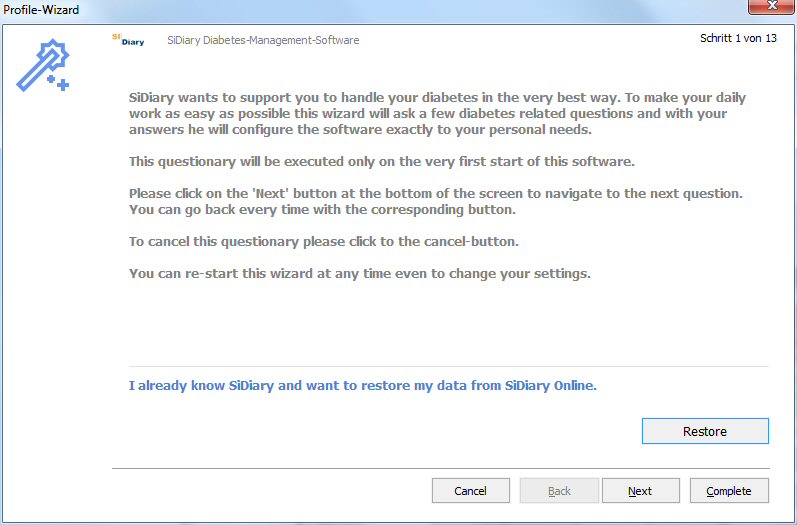 Diabetes-Software SiDiary: Profile wizard When you have started SiDiary for the very first time, it will show you the profile-wizard. This tool will ask some diabetes-related questions and from your answer it will configure the software especially for your individual needs.