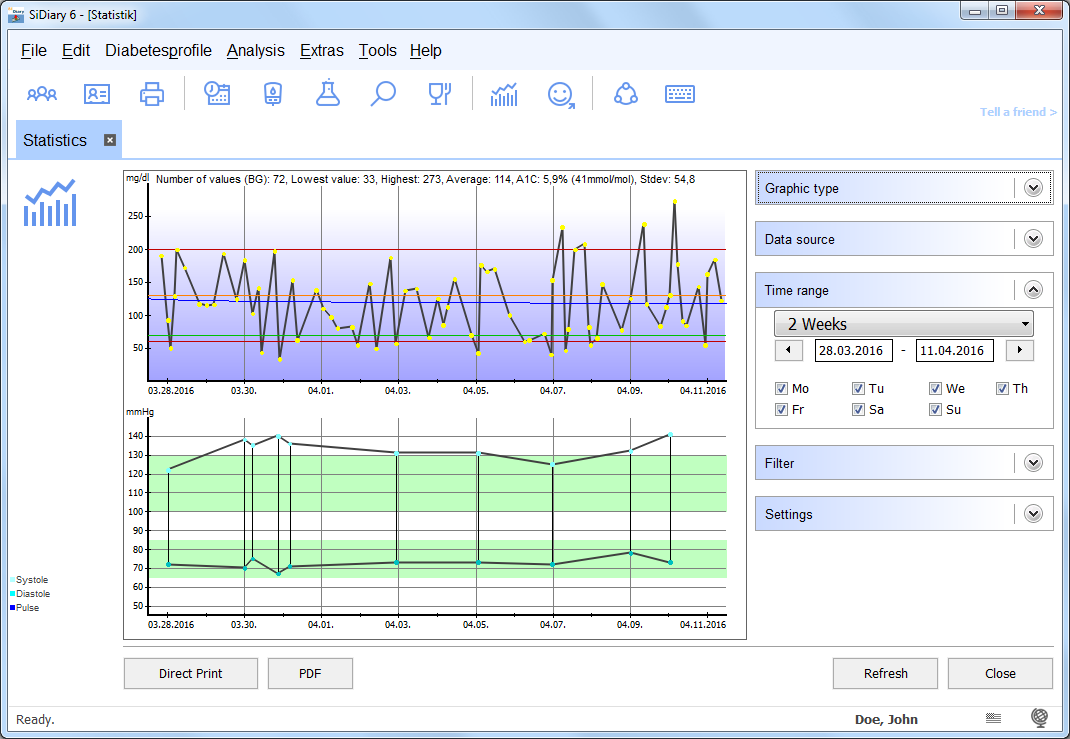 This will give the patient a great overview about the most important parameters, like the average number of BG level readings per day, the calculated A1c, the standard deviation (which can tell about the ups and downs of the BG level) and finally the post-prandial peaks (which can tell about the adjustment-quality of the mealtime bolus).