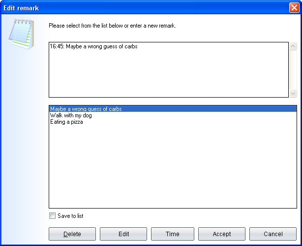 Above you can see the input box and below a shortlist with saved text blocks. You can save a text permanently to the shortlist by activating the checkbox Save to list and then clicking Accept. So the next time you do not have to write down this text – you can click on it and adopt it.